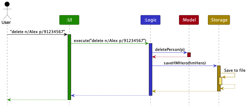 The Sequence Diagram below shows how the components interact with each other for the scenario where the user issues the command delete n/Alex p/91234567.