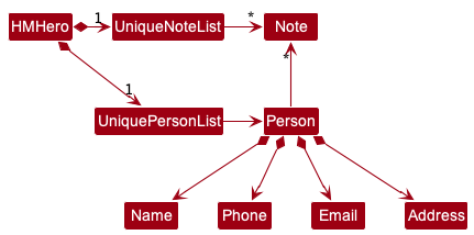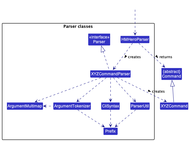 HMHeroclass creates anXYZCommandParser(XYZis a placeholder for the specific command name e.g.,AddCommandParser) which uses the other classes shown above to parse the user command and create aXYZCommandobject (e.g.,AddCommand) which theHMHeroParserreturns back as aCommandobject. - All